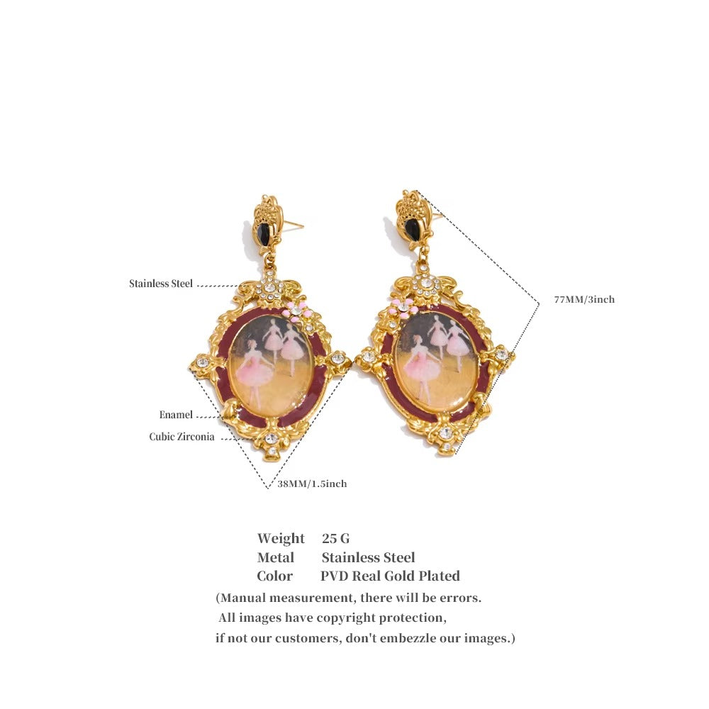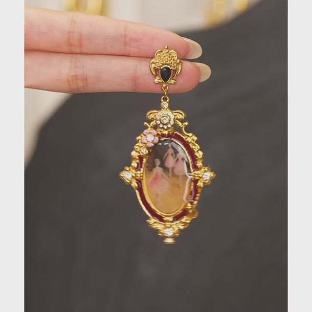 Step into a dream of art, grace, and gold — the Ballerina Muse Earrings are where jewelry meets poetry. Inspired by vintage portrait frames, these earrings feature an intricate gold design with crystal accents and miniature ballerina artwork at the center — a nod to elegance and movement.