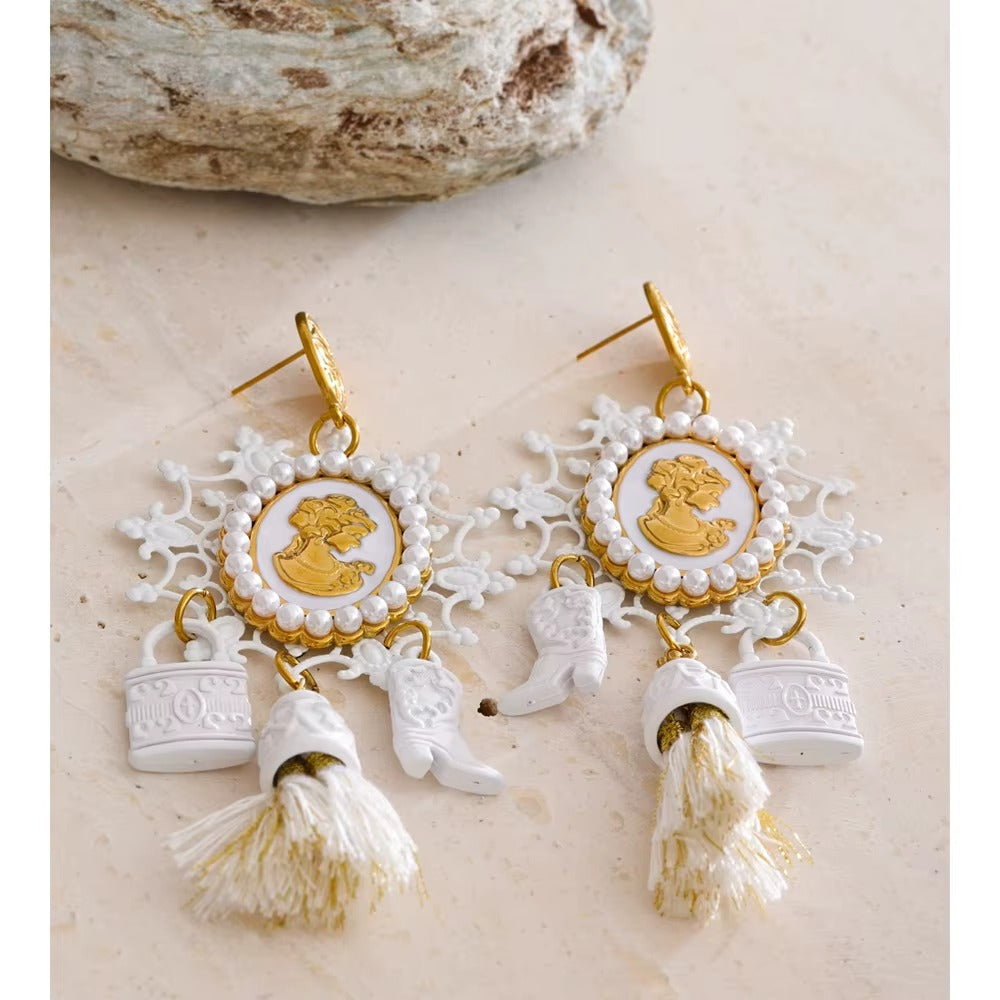 Classic, elegant, and beautifully detailed — the Cameo Royale Earrings (Ivory Gold) bring old-world artistry to your festive wardrobe. Featuring a vintage-style cameo centerpiece framed with lustrous pearls and finished with ivory tassels and miniature charms, these earrings feel straight out of a royal portrait.