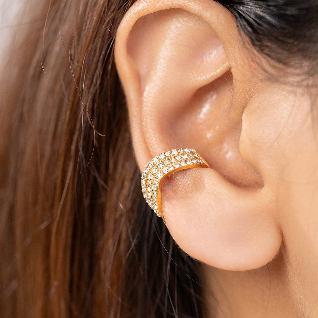 Make your ear game shine without the piercings ✨ The Sparkle Wave Ear Cuff wraps your ear in three dazzling rows of crystals, giving the illusion of stacked hoops with zero effort. Designed for comfort and style, this cuff slips on easily and stays put—perfect for when you want to glow up your look in seconds.
