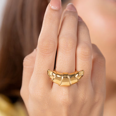 Paris in a ring. Croissant Ring is a sculpted, golden statement piece inspired by the buttery folds of a fresh pastry. Textured, bold, and beautifully curved — this piece adds a delicious twist to any outfit. Chic, shiny, and totally Instagram-worthy.