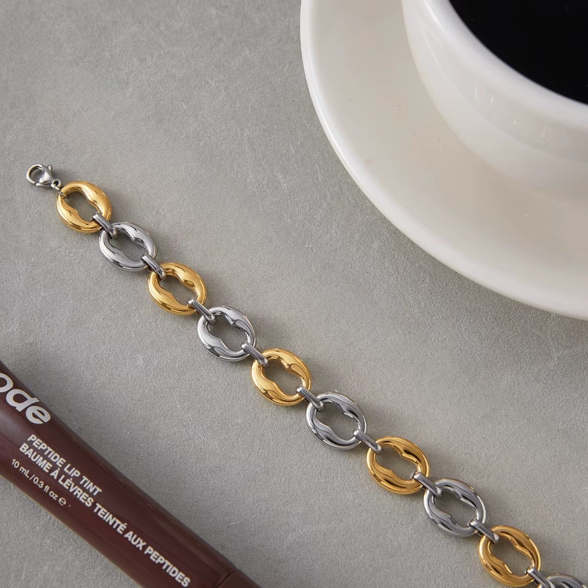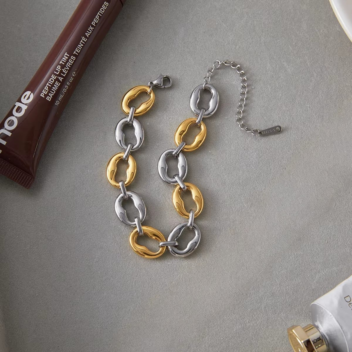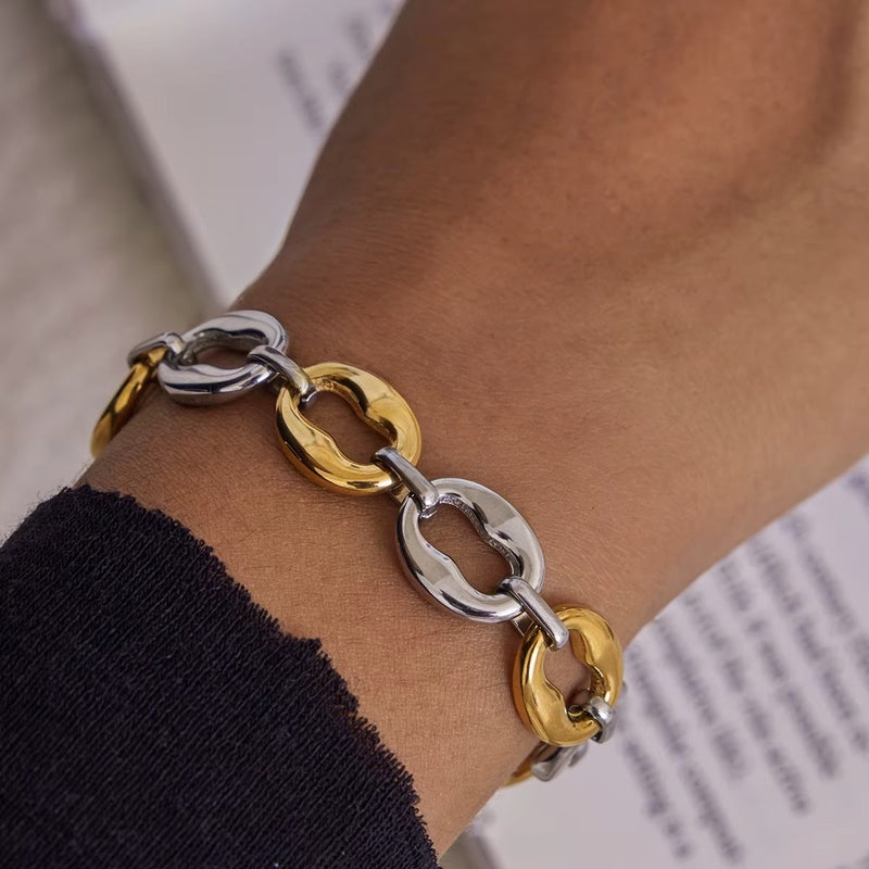 A bold, aesthetic bracelet designed for girls who love mixing metals without thinking twice. The LinkFusion Bracelet blends gold and silver tones in a chunky, modern chain that instantly elevates your stack. Lightweight, statement-making, and built for everyday wear — this is that one bracelet people always ask you about.