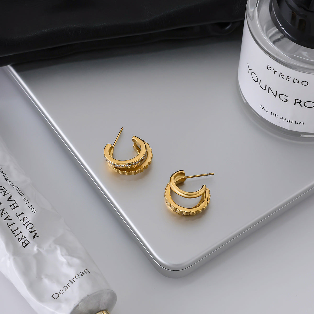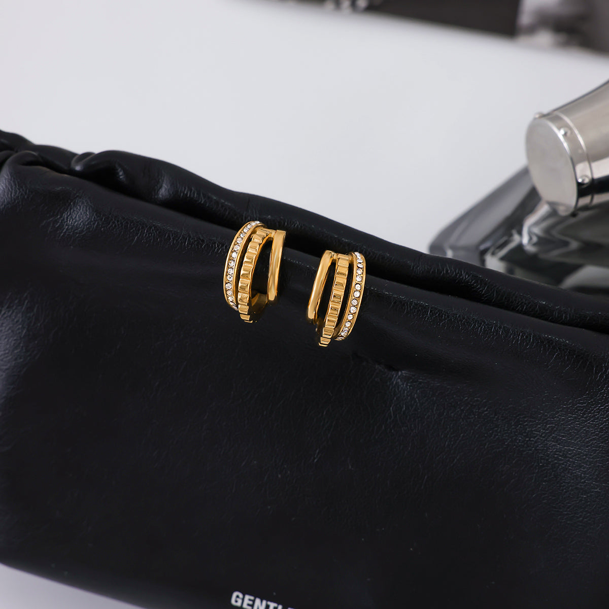 Featuring a stunning triple-band illusion, these earrings combine a sleek gold finish with an intricate engraving and a band of shimmering crystals. It is the ultimate "old money" aesthetic reimagined for the modern era