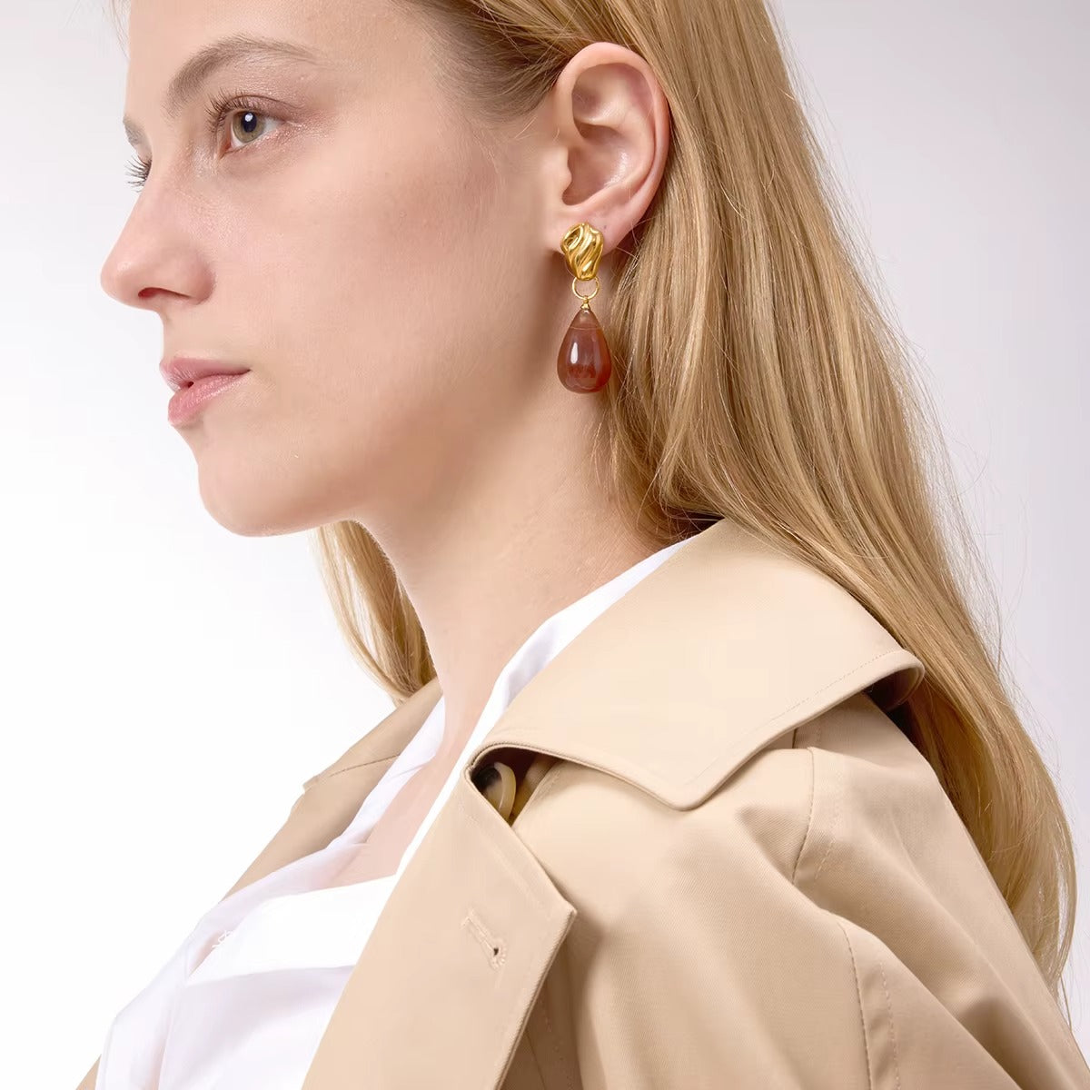The Amber Gleam Earrings bring warmth and sophistication with every glance. Their molten gold base and glossy amber-toned teardrop create a balance of boldness and grace — perfect for elevating even the simplest outfit. Think of them as your go-to for golden hour glow, minus the sunset.