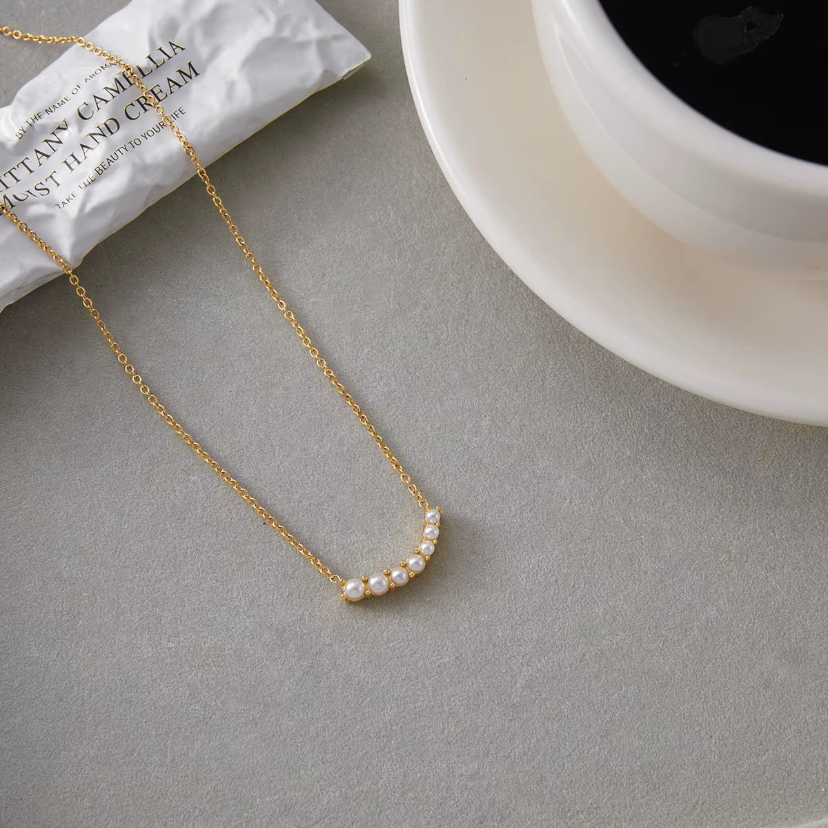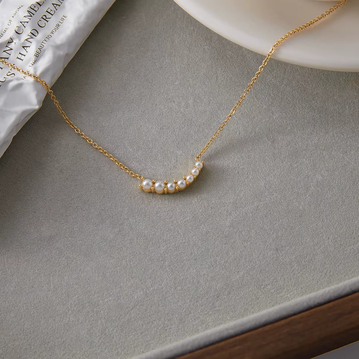 The Clairé Arc Necklace captures understated elegance in its purest form. Seven petite pearls rest along a sleek gold arc — symbolizing harmony, grace, and timeless femininity.