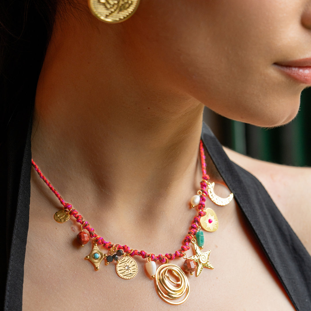 Bold yet graceful, the Celestial Charm Statement Necklace features a stunning combination of natural pearl and shell stone. With its striking design and luxurious finish, this statement piece adds a touch of refined elegance to any outfit.