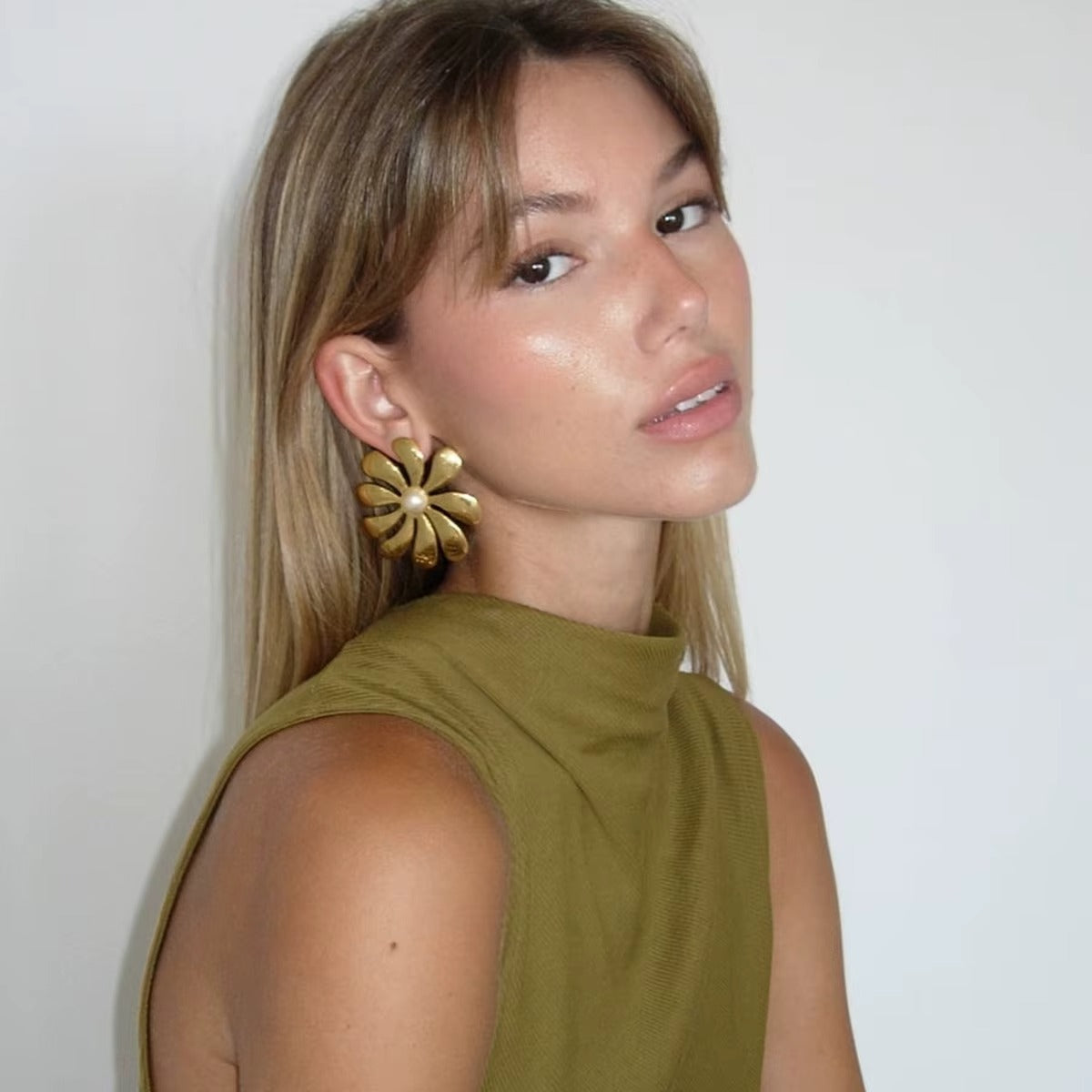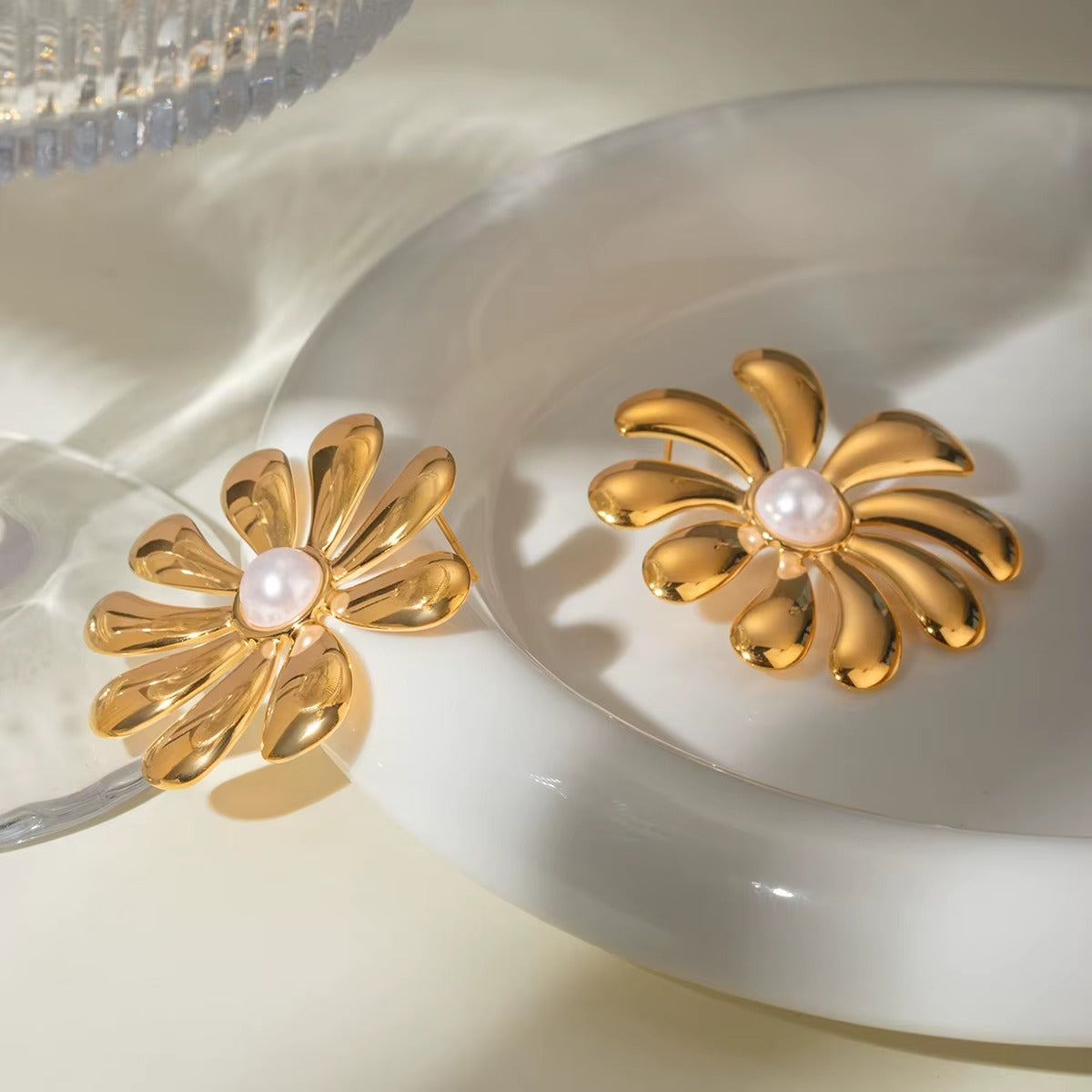 The Fioren Bloom earrings are an ode to fearless femininity — where art meets attitude. Crafted in high-shine PVD gold, their petal-shaped form radiates confidence and charm with every turn. The central pearl detail adds a soft, romantic glow, making them the ideal conversation starters for brunches, gallery walks, or nights that deserve a little drama.