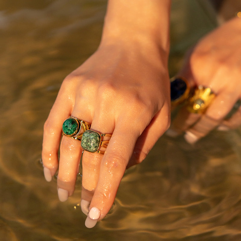 A whole forest in a ring. This bold piece features a deep green marbled stone framed by etched gold leaves—a nature-inspired stunner that feels both ancient and modern. It’s adjustable, waterproof, and skin-safe. Wear it when you're manifesting growth, grounding, or just a gorgeous outfit.