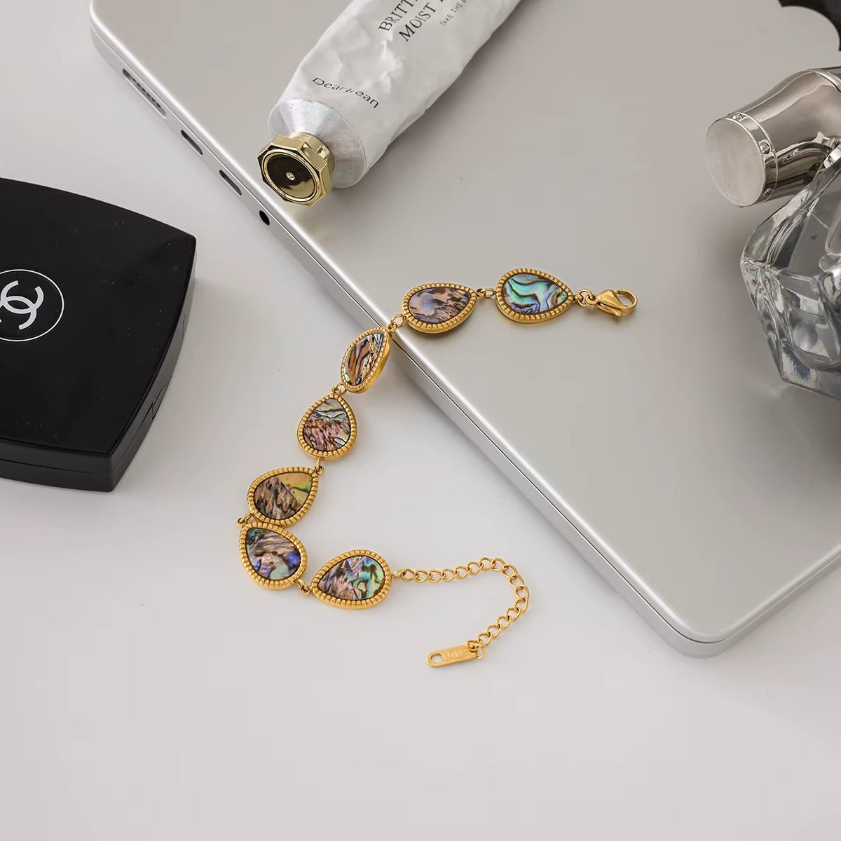 Inspired by the rhythm of the sea, the Marinelle Bracelet captures the glow of sunlight reflecting off calm ocean waves. Each teardrop shell shimmers with natural iridescence, framed in polished gold to add that hint of understated luxury.