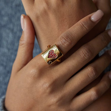 The Rouge Heart Ring is for the fearless romantic — unapologetically bold yet timeless. Its vivid red stone-set heart glows against rich PVD gold plating, making it a statement piece that celebrates love in all its forms — passionate, powerful, and proud.