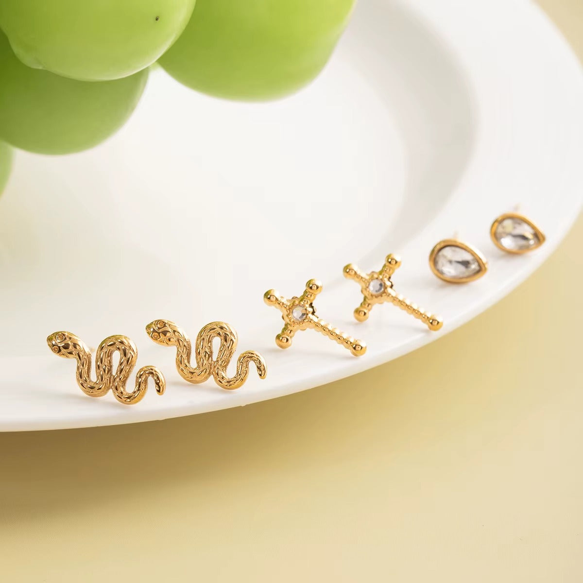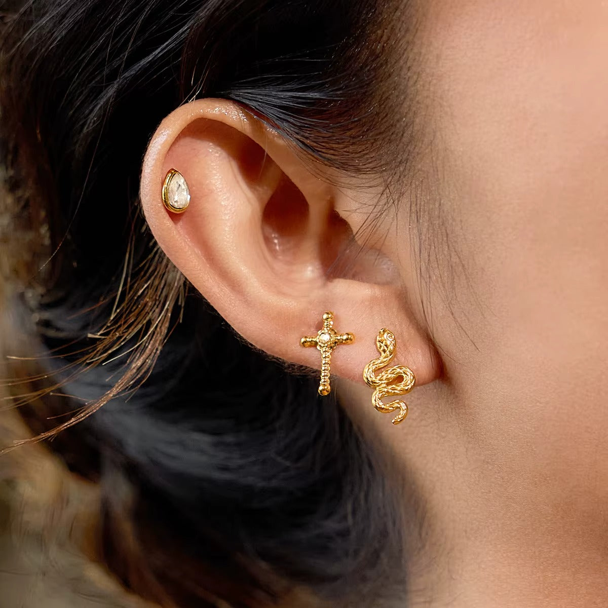 Three styles, endless combinations — the Zodiac Trio Set brings together a serpent, a cross, and a teardrop-shaped stud for that perfect curated-ear look. Each piece adds its own charm: bold, classic, and subtle. Whether you wear them solo or stacked, this set lets you style your mood your way.