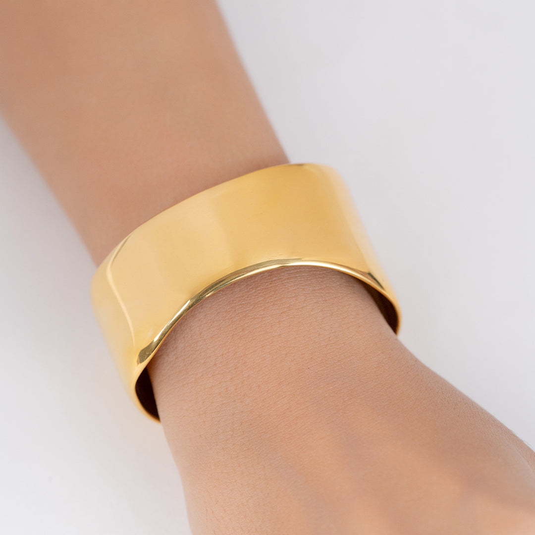Eternal Glow Cuff exudes timeless elegance with its smooth, polished gold finish. Designed for versatility and impact, this bold statement piece adds a touch of sophistication to any look.