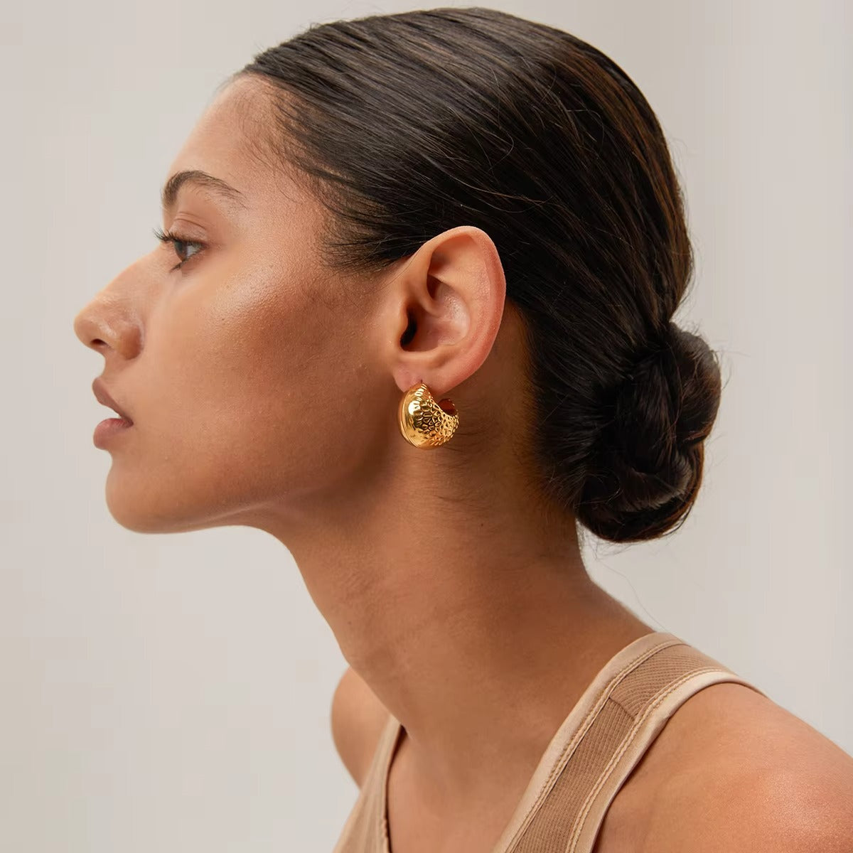Lunar Luxe Hoops feature a unique hammered texture in a crescent shape that catches light from every angle. Bold yet wearable, these gold-toned hoops bring a sculptural twist to your look—whether it’s a blazer or a backless dress.
