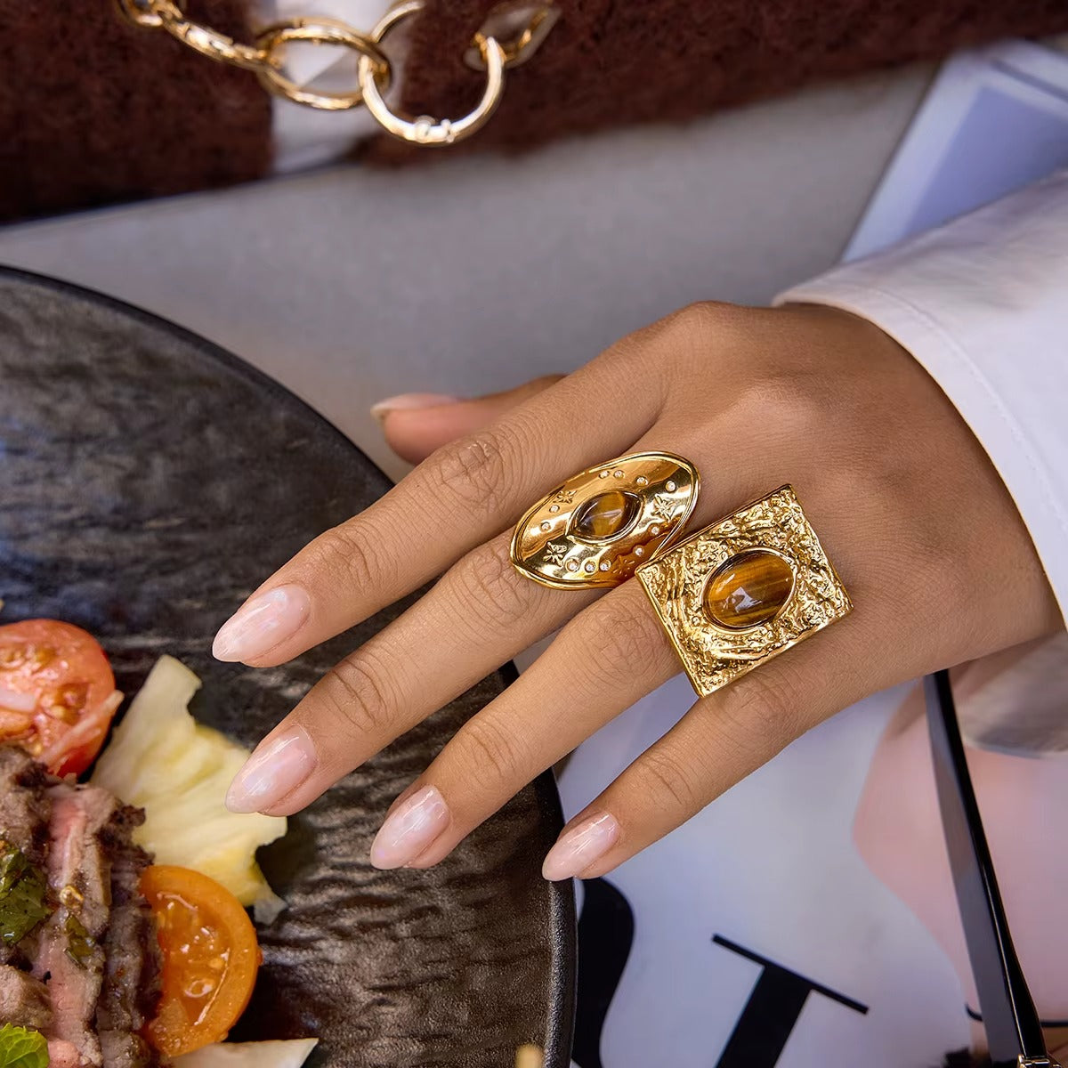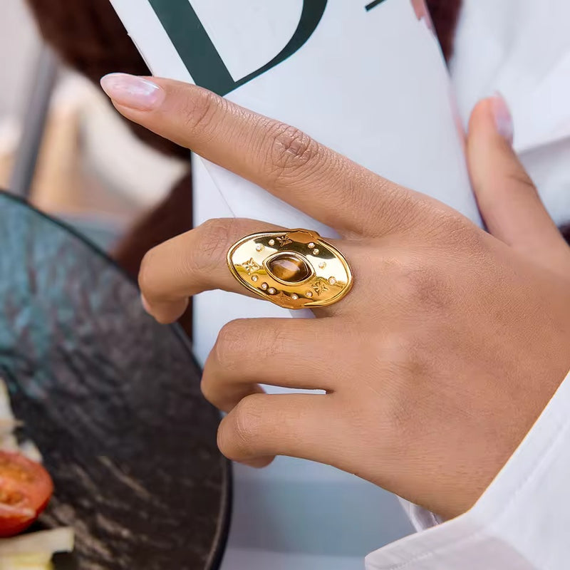 This oval statement ring captures celestial energy with its sculpted gold surface and deep tiger-toned center stone.