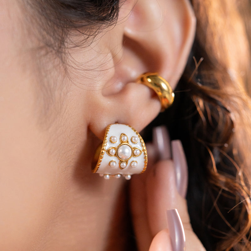 Big hoops. Bolder vibes. The Pearl Pop Hoops are all about bringing that royal-meets-cute drama with enamel shine, scattered pearl accents, and a chunky gold frame. Whether you're dressed up or down, these skin-friendly and waterproof stunners add that desi-glam punch you didn’t know you needed.