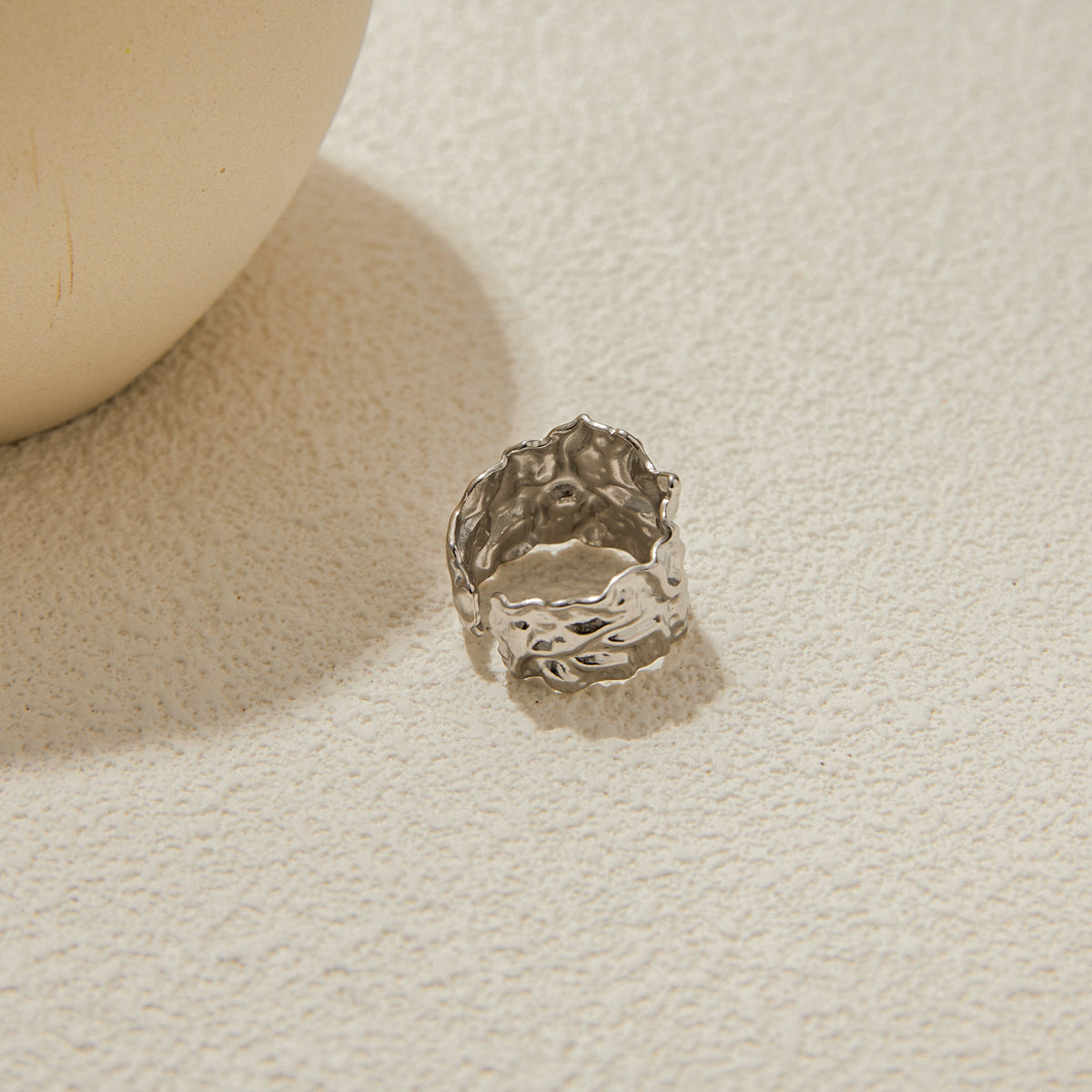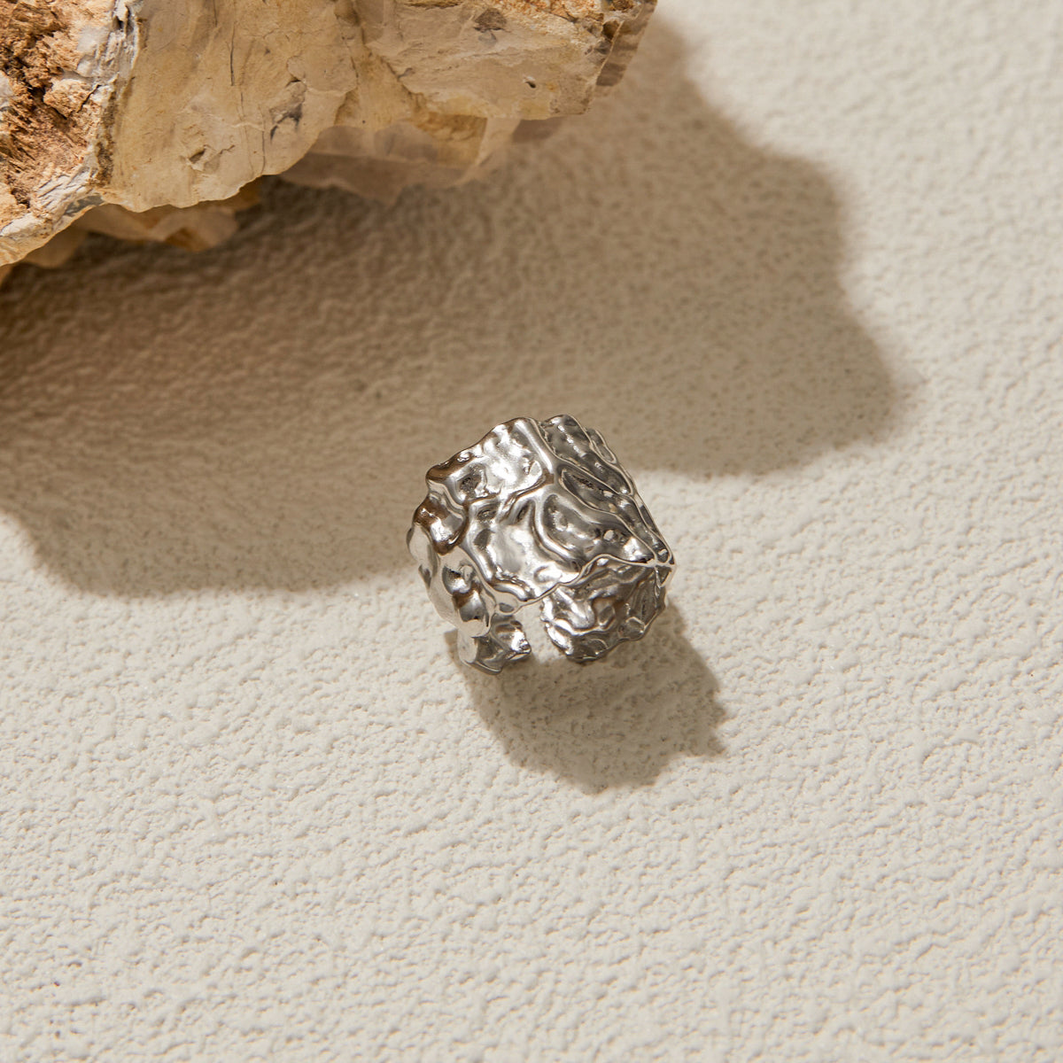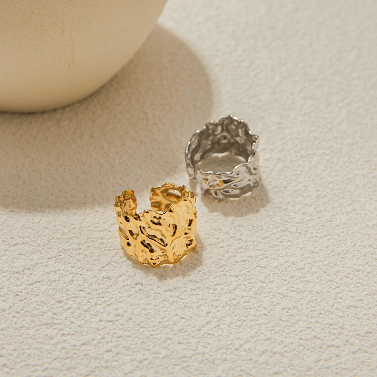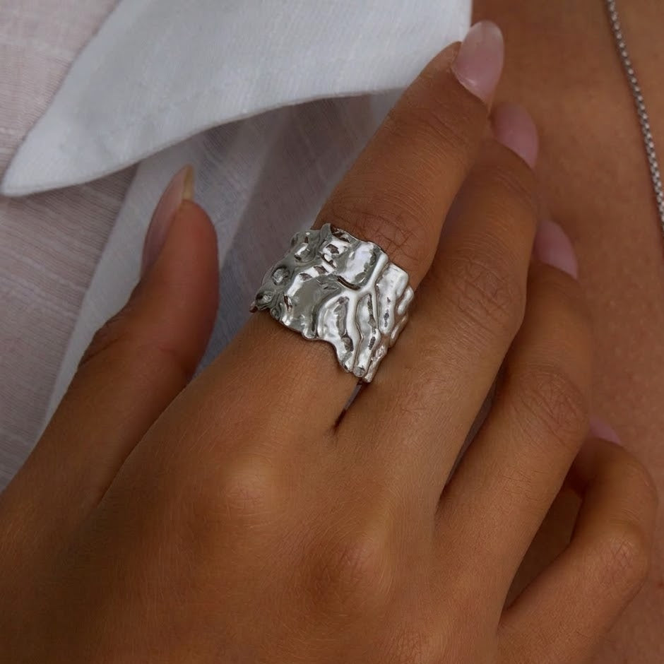 Aurora Texture Ring features a bold, organic design with a radiant gold-tone finish. This statement piece is perfect for adding a touch of artistic elegance to your everyday or occasion wear.