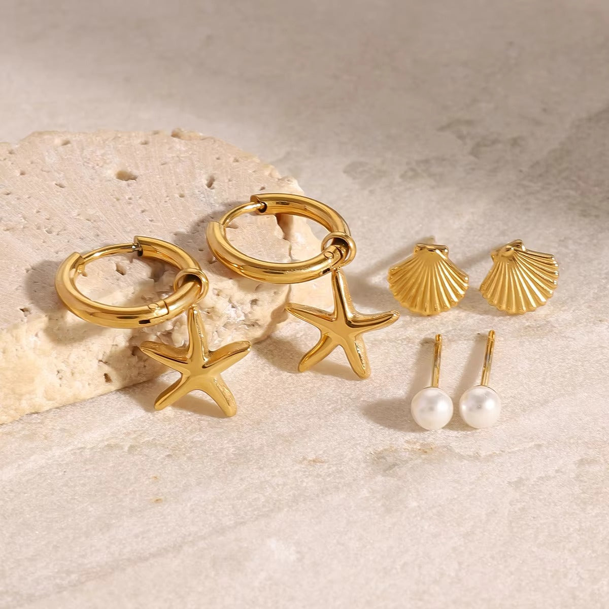 This golden trio featuring a starfish charm, shell studs, and pearl drops is everything your vacation (or desk daydream) needs.