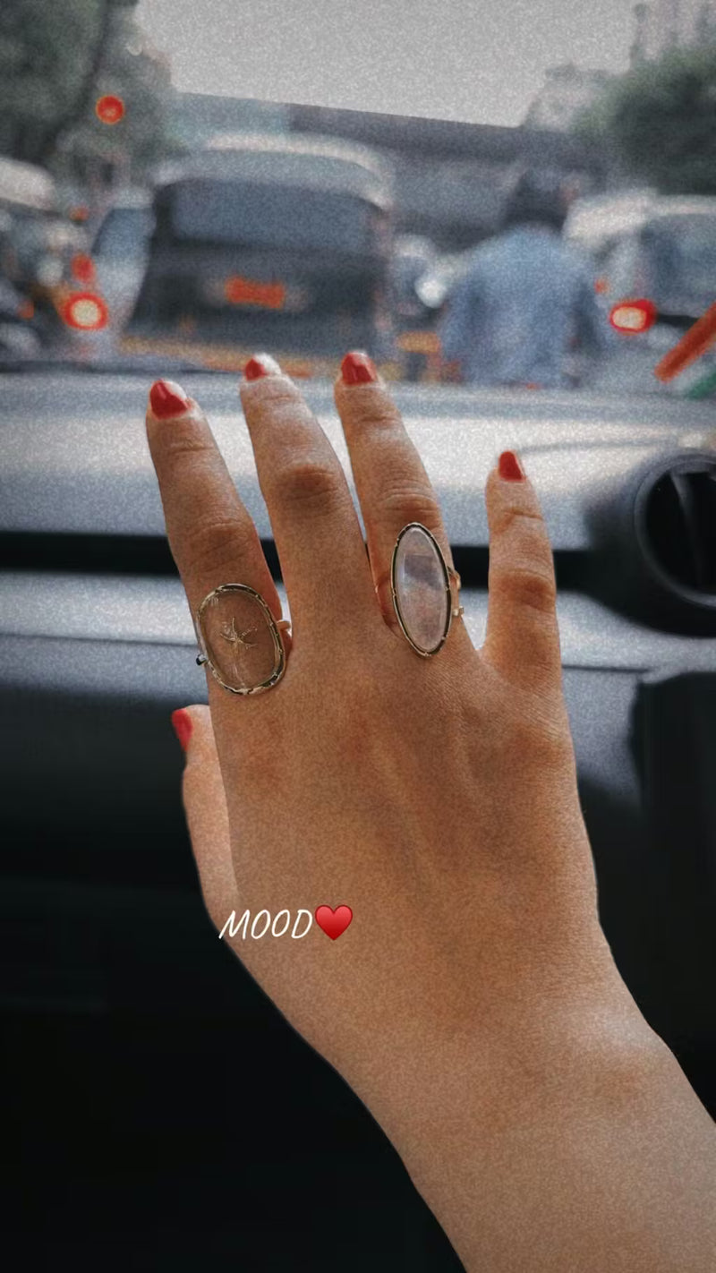 The Moonstone Muse Ring features a long oval faux moonstone set in a sleek PVD gold-plated frame—designed to catch light (and attention) from every angle. With a modern open band, this piece adds elegance to any hand stack.
