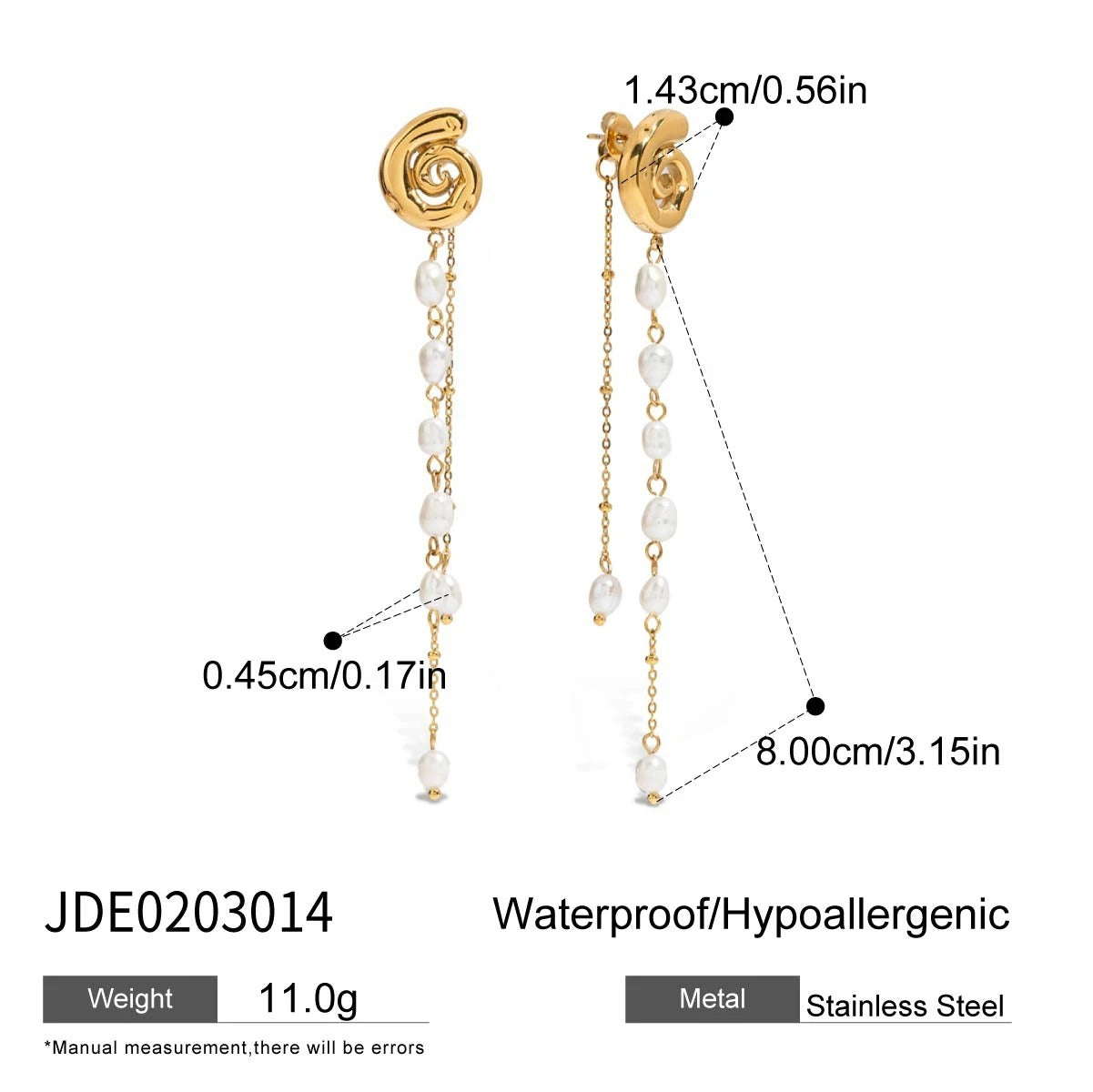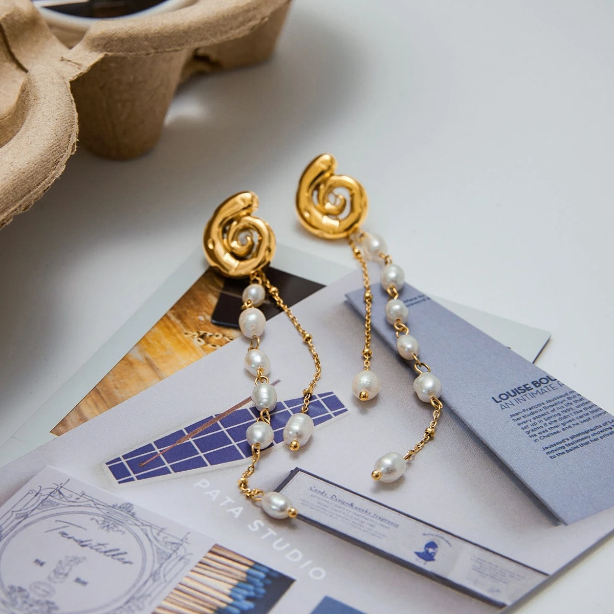 Add a playful twist to elegance with the Twirl & Pearl Earrings. Featuring a bold gold spiral stud that flows into a delicate chain of dangling pearls, this design is equal parts modern and timeless.